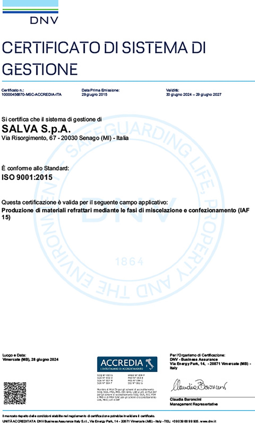 SALVA S.p.A. ha ottenuto la conformità ai requisiti della norma per il Sistema di Gestione Qualità relativamente alla produzione di materiali refrattari mediante le fasi di miscelazione.